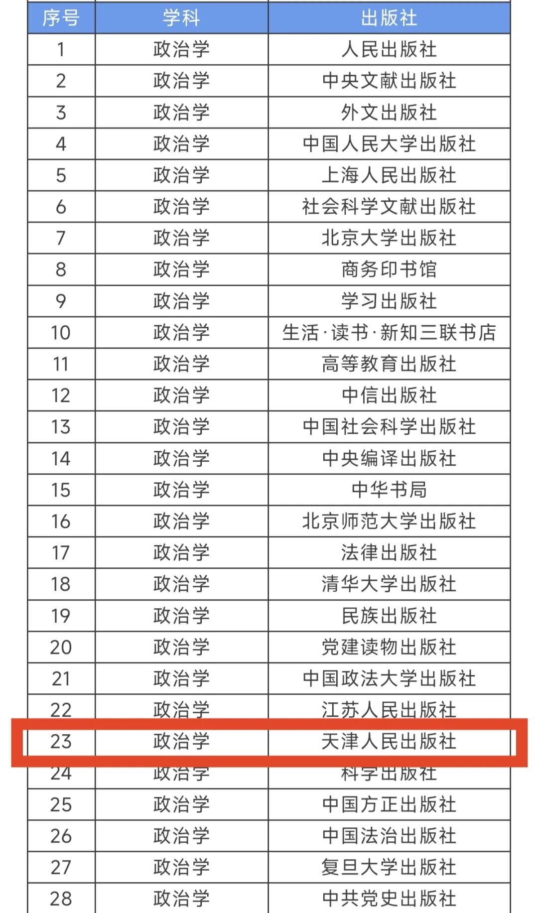 天津人民出版社入选政治学领域最具学术影响力出版社(2015—2024)