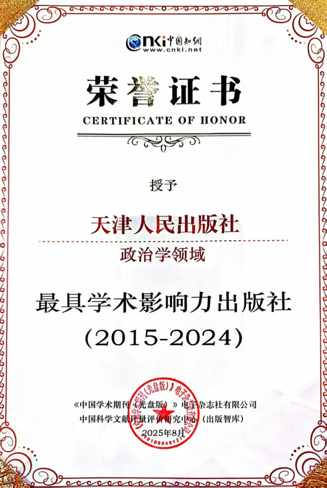 天津人民出版社入选政治学领域最具学术影响力出版社(2015—2024)、地方人民出版社学术影响力TOP10(2015—2024)。